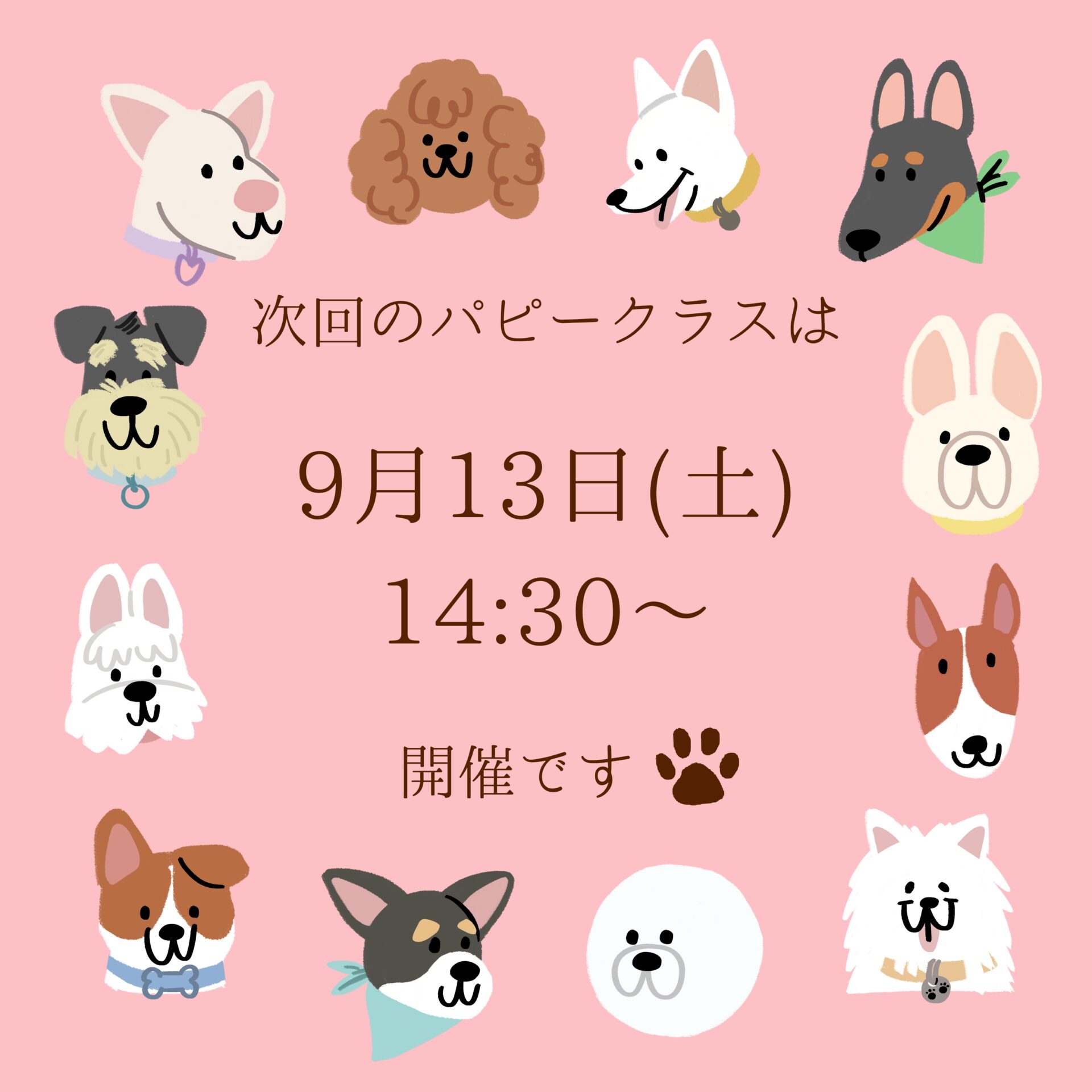 次回のパピークラスのお知らせ 投稿日 2025年9月7日 更新日 2025年10月13日 カテゴリー お知らせ 次回のパピークラスは9月13日(土)14:30から開催します。子犬との信頼関係を築く方法や社会化のトレーニングなど、楽しく学んでいきましょう! パピークラス 社会化